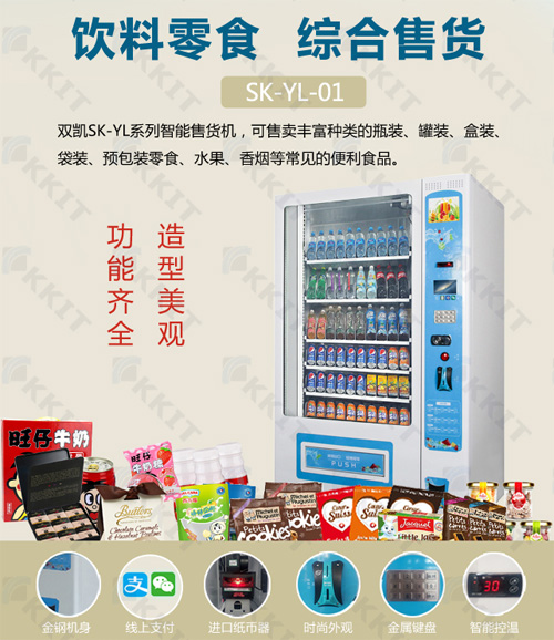 如上圖所示,SK-YL-01款飲料自動售貨機可售賣瓶裝、罐裝、盒裝、預包裝零食、水果等常見的便利食品。
